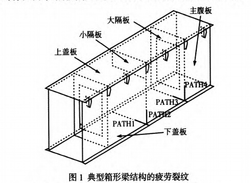 通過對在役橋門式起重機的實際檢測和疲勞試箱形梁結構的高發性疲勞裂紋,主要發生在下蓋板與主腹板間的縱向受拉翼緣焊縫和大隔板與主腹板連接焊縫下端的焊趾處,其疲勞裂紋萌生源和擴展機理,如表1所示。]