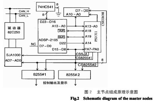 系統(tǒng)主節(jié)點結(jié)構(gòu)原理圖,如圖 2 所示。 中央處理器采用美國模擬器件公司生產(chǎn)的 ADSP2105。它是一種高性價比、性能成熟的 DSP 器件, 在一個 100ns 周期內(nèi),可以完成如下操作:取兩個操作數(shù),修改指向操作數(shù)的地址單元,使兩個操作數(shù)相乘 并將結(jié)果累加到一個 40 位的和中。由于程序循環(huán)在硬件內(nèi)完成,所以每 100ns 能執(zhí)行一次這些高級指令 的操作。WSI 的 PSD311 可編程外圍器件有效地將可編程邏輯、I/O 端口和存儲器集成在一塊芯片上,可 以實現(xiàn)本系統(tǒng)的外圍功能。ADSP2105 在與 PSD311 等外圍器件聯(lián)絡(luò)方面提供了很大的時序靈活性。它 可以為 4 個分開的存儲器空間中的每一個單獨分配等待狀態(tài)數(shù)量,以適應很寬的時序差別。我們在 ADSP2105 的 “ 等待寄存器”為 EPROM、RAM 和外部存儲器的選通脈沖安排 1 個等待狀態(tài),即 200ns 周期 時間,以滿足 PSD311 120ns 器件的時序要求。由于總線的通路布在 ADSP2105 的里面,PSD311 的數(shù)據(jù)線 與 D15~D8 連接。ADSP2105 的 “ D22”線提供 PSD311 的 “ A14”地址線,BMS(Boot Memory Select)充當 EPROM 的片選并與 PSD311 的 “ A19”輸入相連接。 選用 SJA1000 作為 CAN 控制器,驅(qū)動器使用 CAN 控制器接口芯片 PCA82C250。EEPROM 用作數(shù)據(jù) RAM,用于保存設(shè)置輸入的關(guān)鍵數(shù)據(jù),以防掉電時丟失。